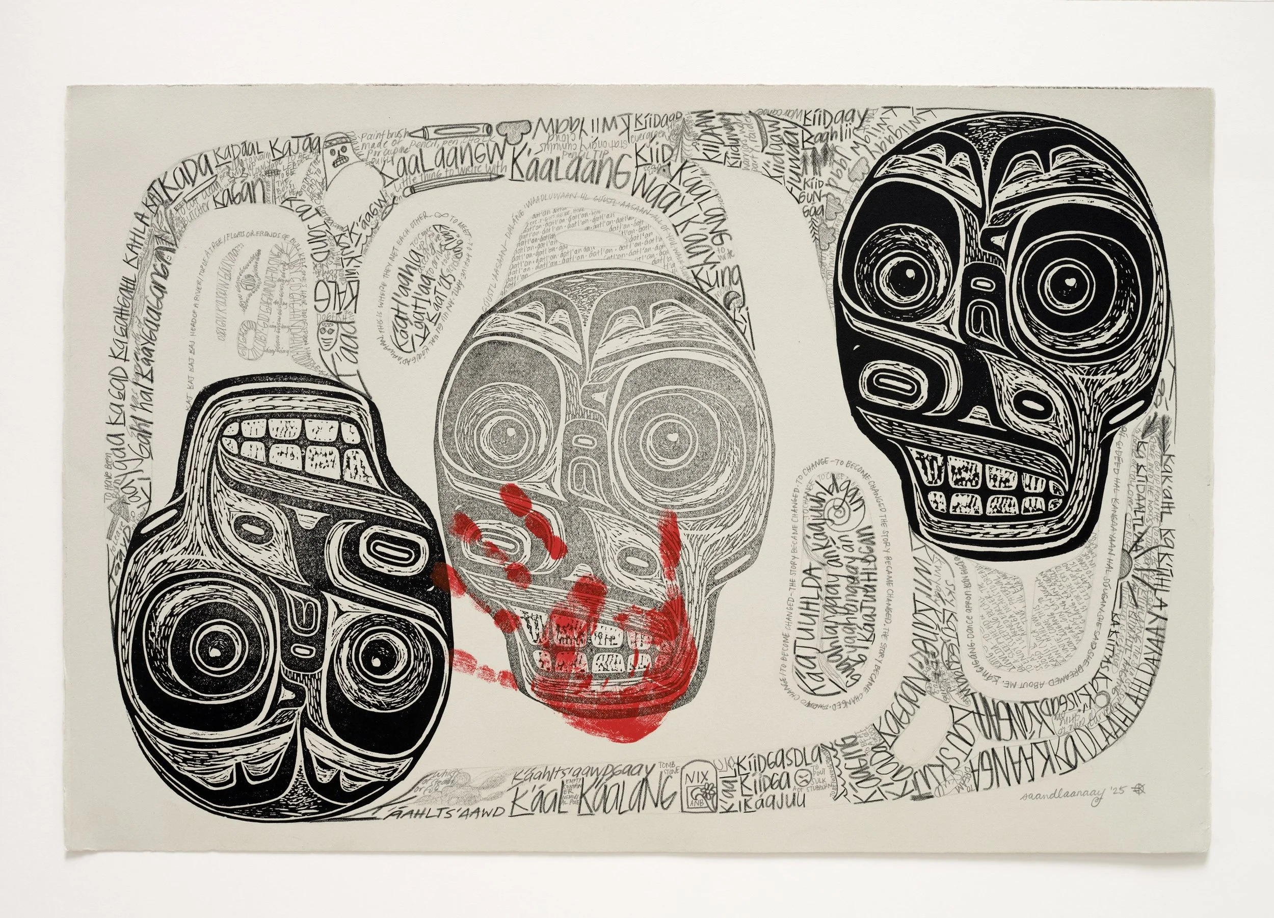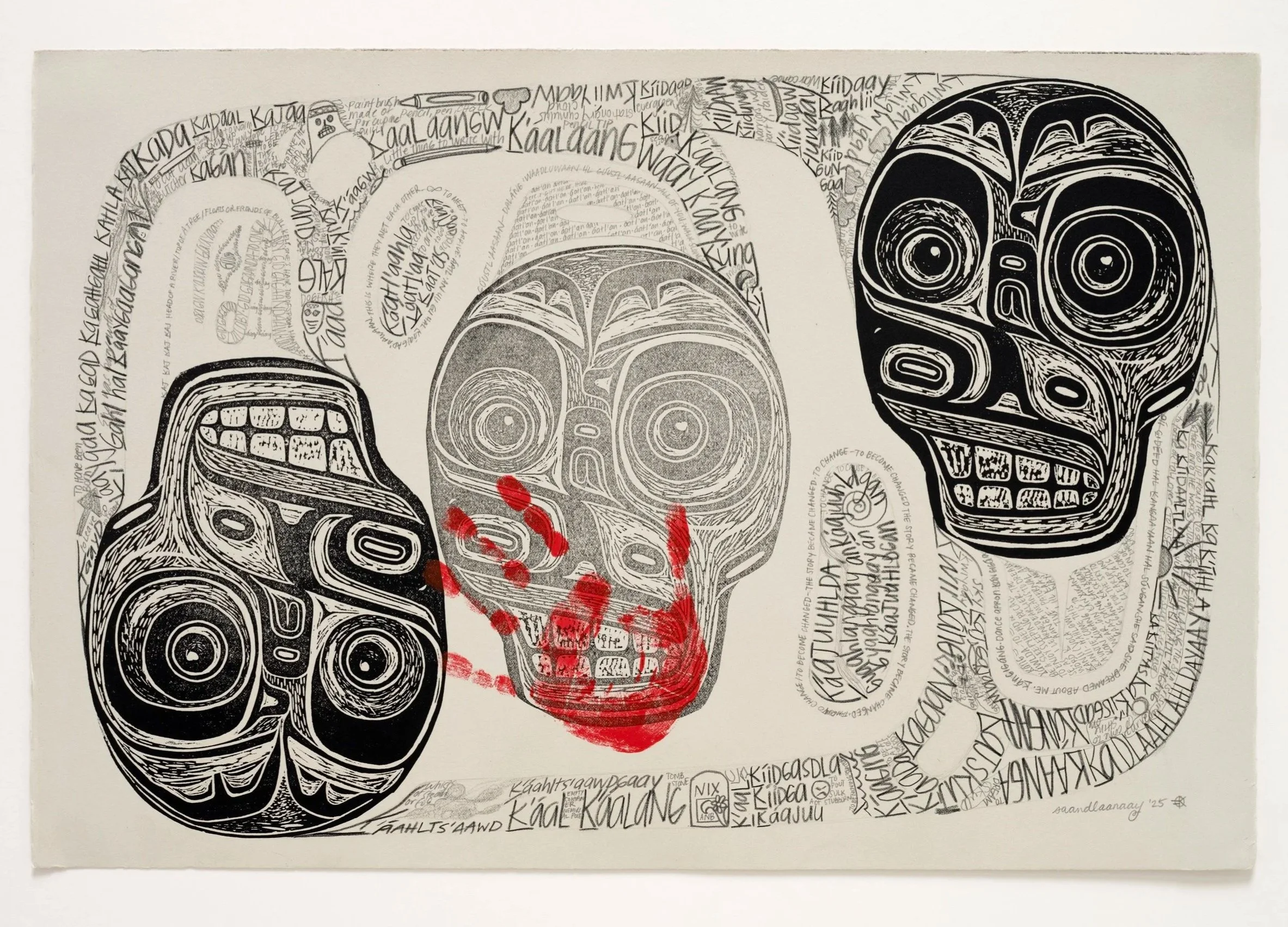 The kajskuj, or skull, is held in a formline dream of words in Xaad Kíl, many beginning with the underlined k. The verb káajuuhlda means “to become changed.” Cultural continuance transforms the story written in nation-building archival records that seek to define how Native people exist today. our language learners and culture bearers—those who breathe life into our language, rekindling its connection to Land and ensuring its song endures for generations to come.