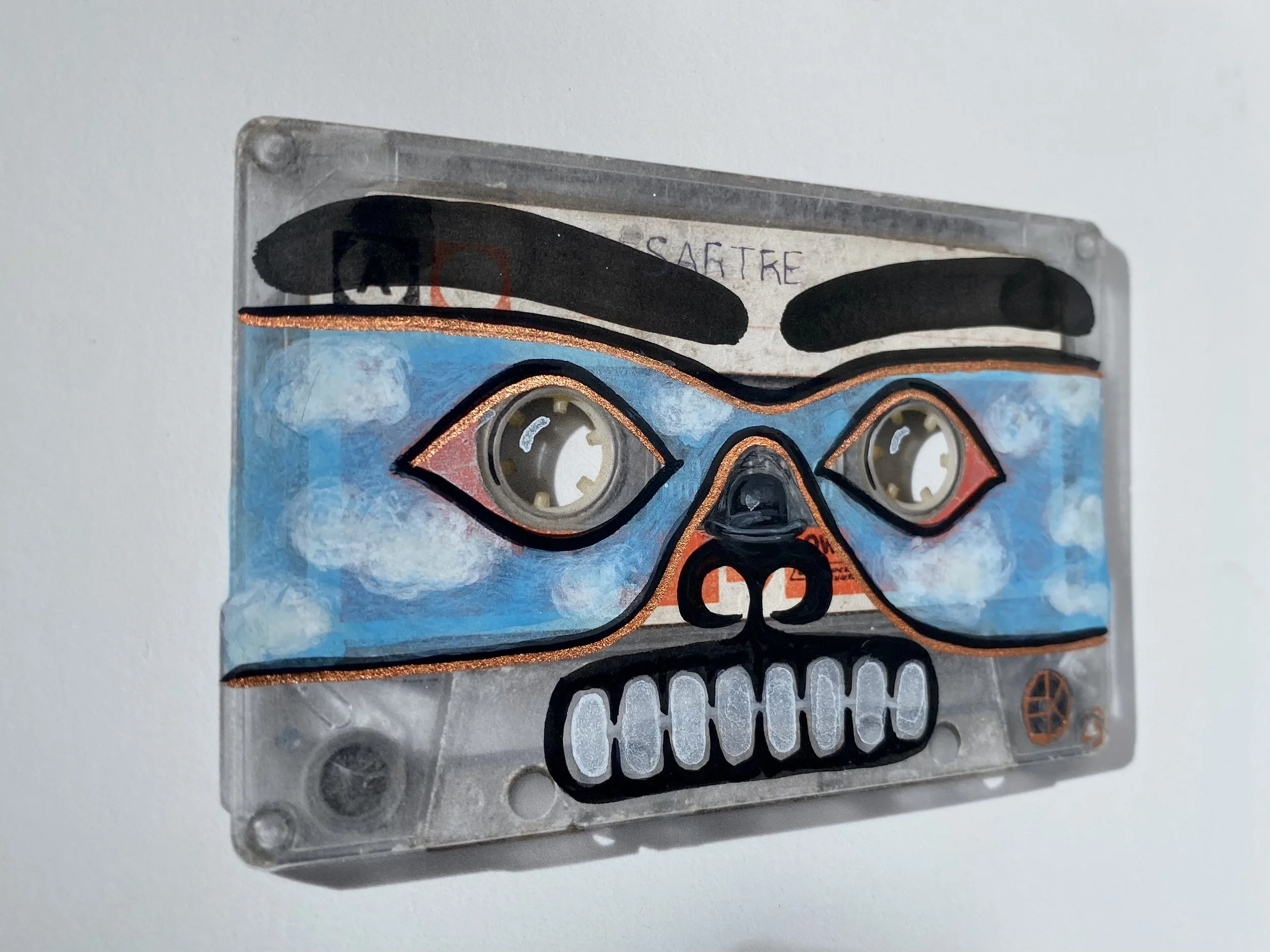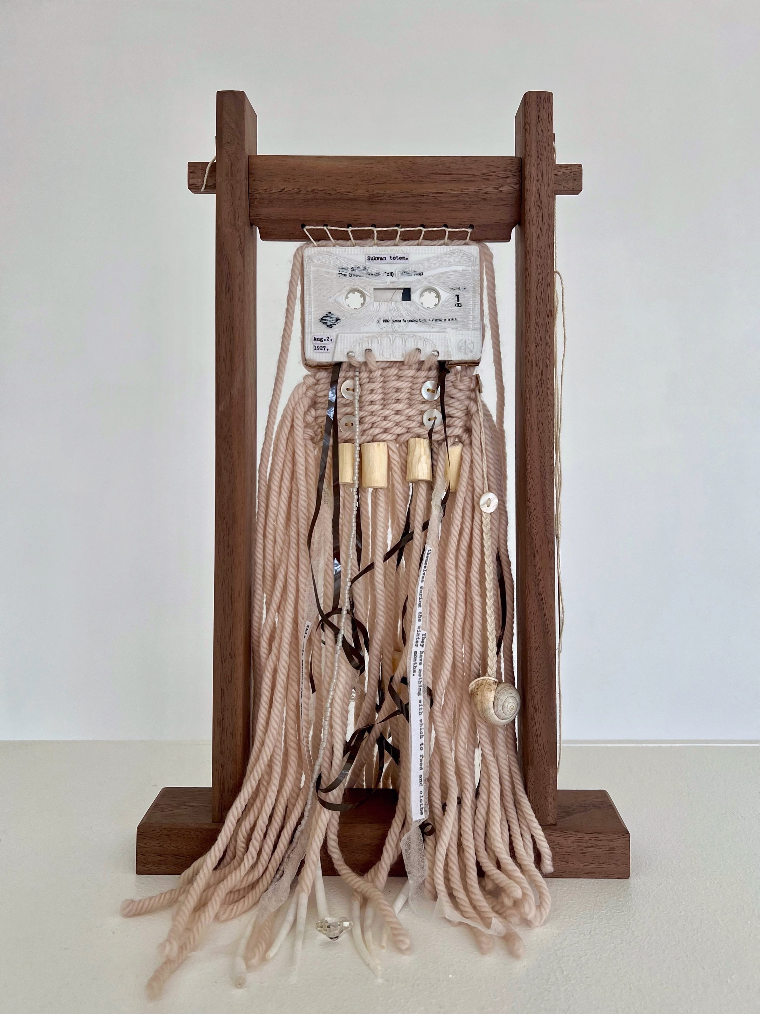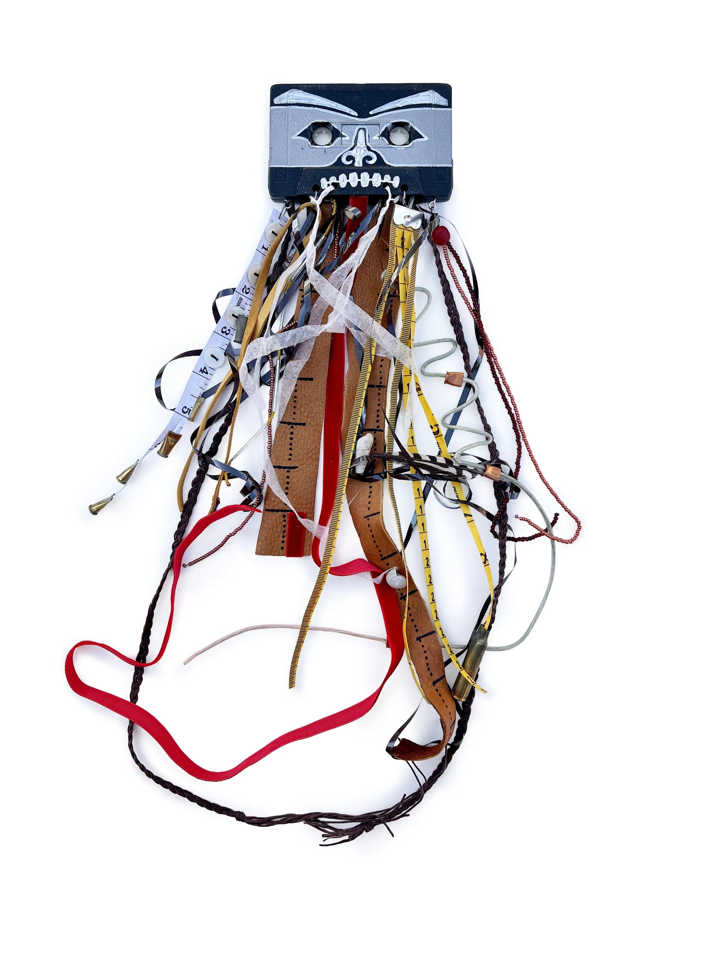 ḵaahláang an unsád, iitl' tláawhla ḵuyaadang is a cassette tape rendered unplayable by artistic intervention. What the tape now holds is a recording of care and meaning through adornment that denies the object’s original function, calling into question signifiers of its purpose. It gives an artifact from time past a new life without completely erasing its nature or relying on technology that is no longer relevant.