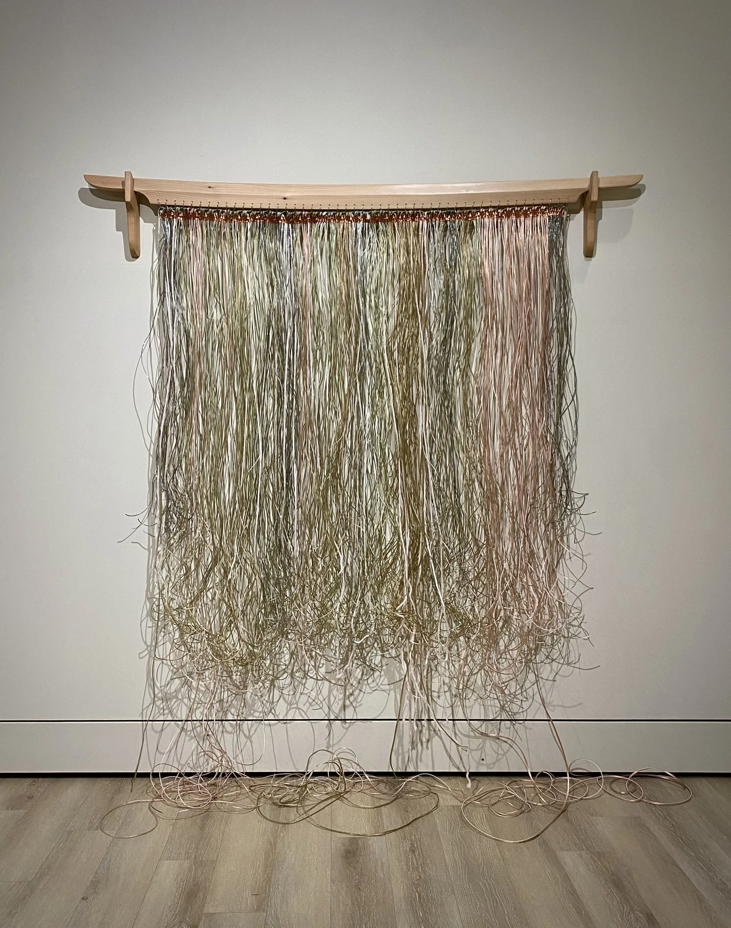 serigraph, monoprint, conte crayon, charcoal, mulberry paper, gold leaf, and merino wool on paper with cotton cord & ebonized white oak loom