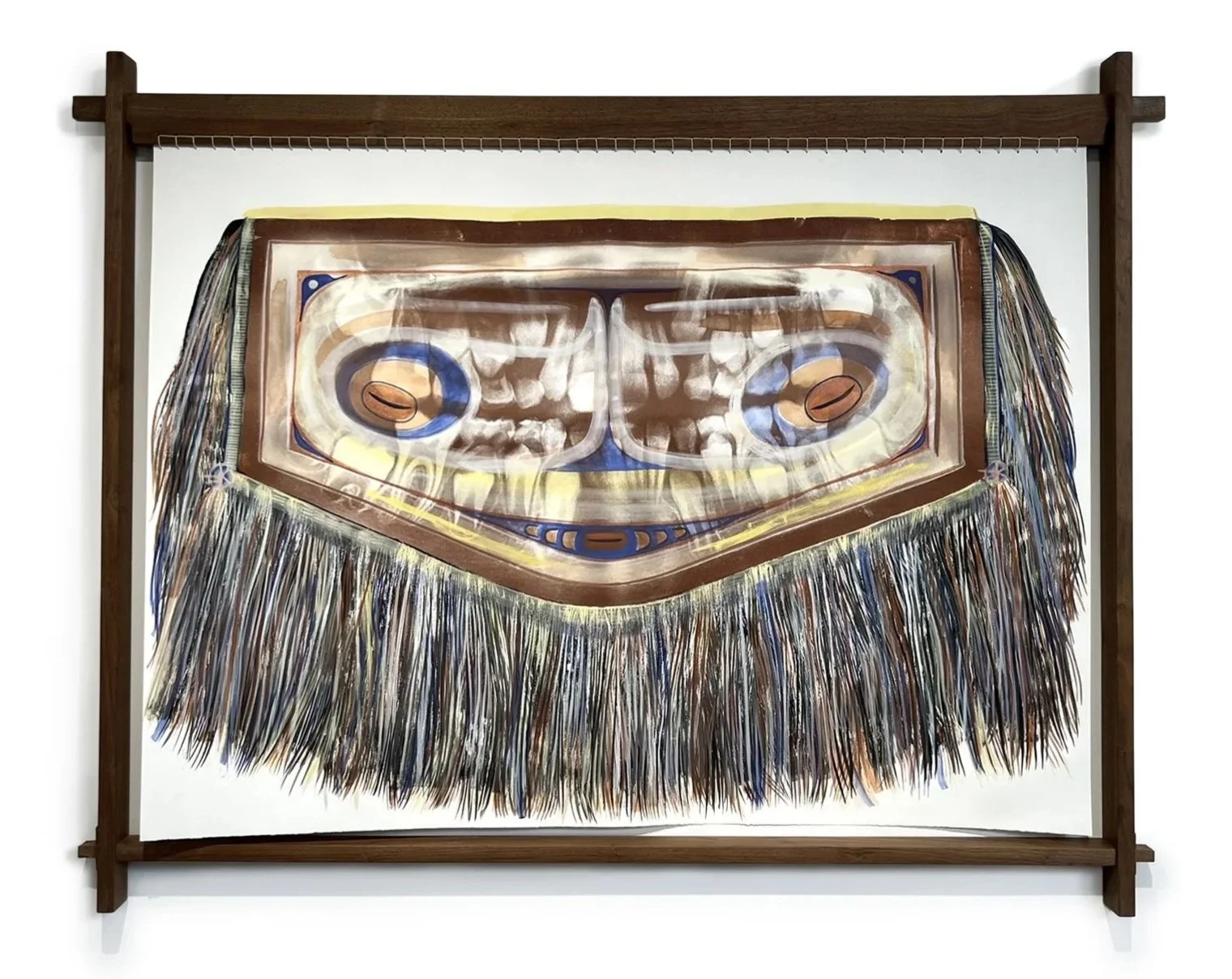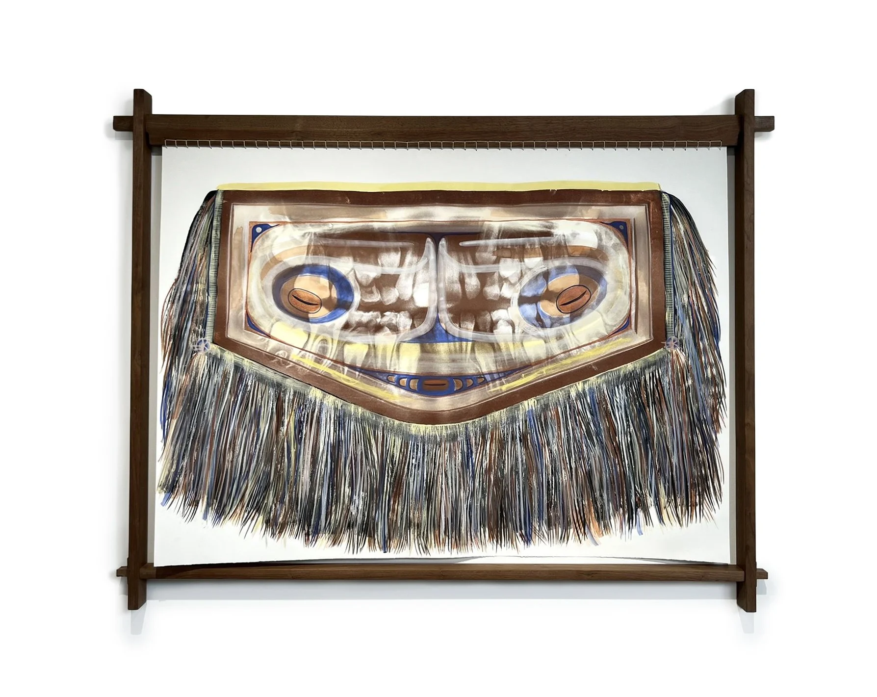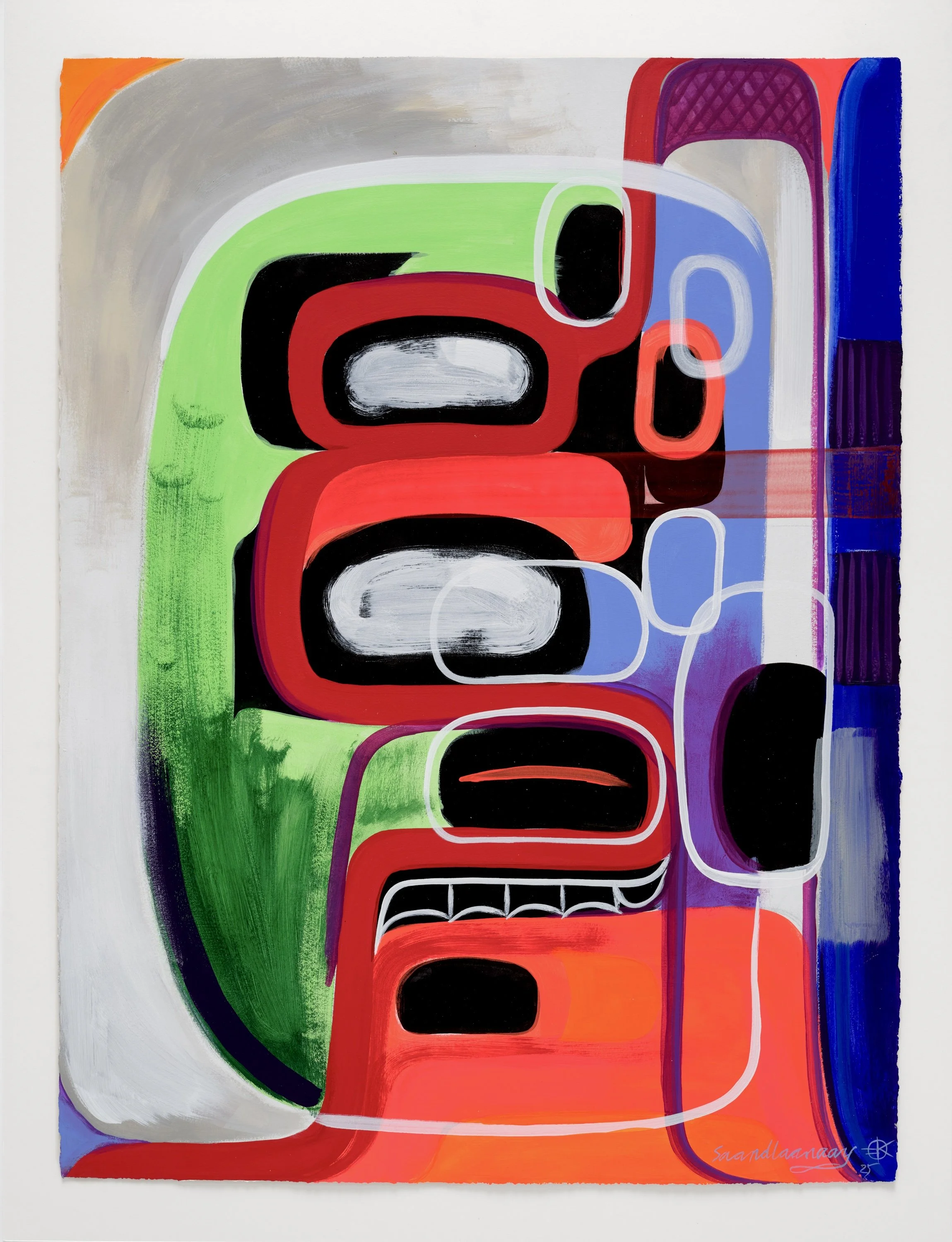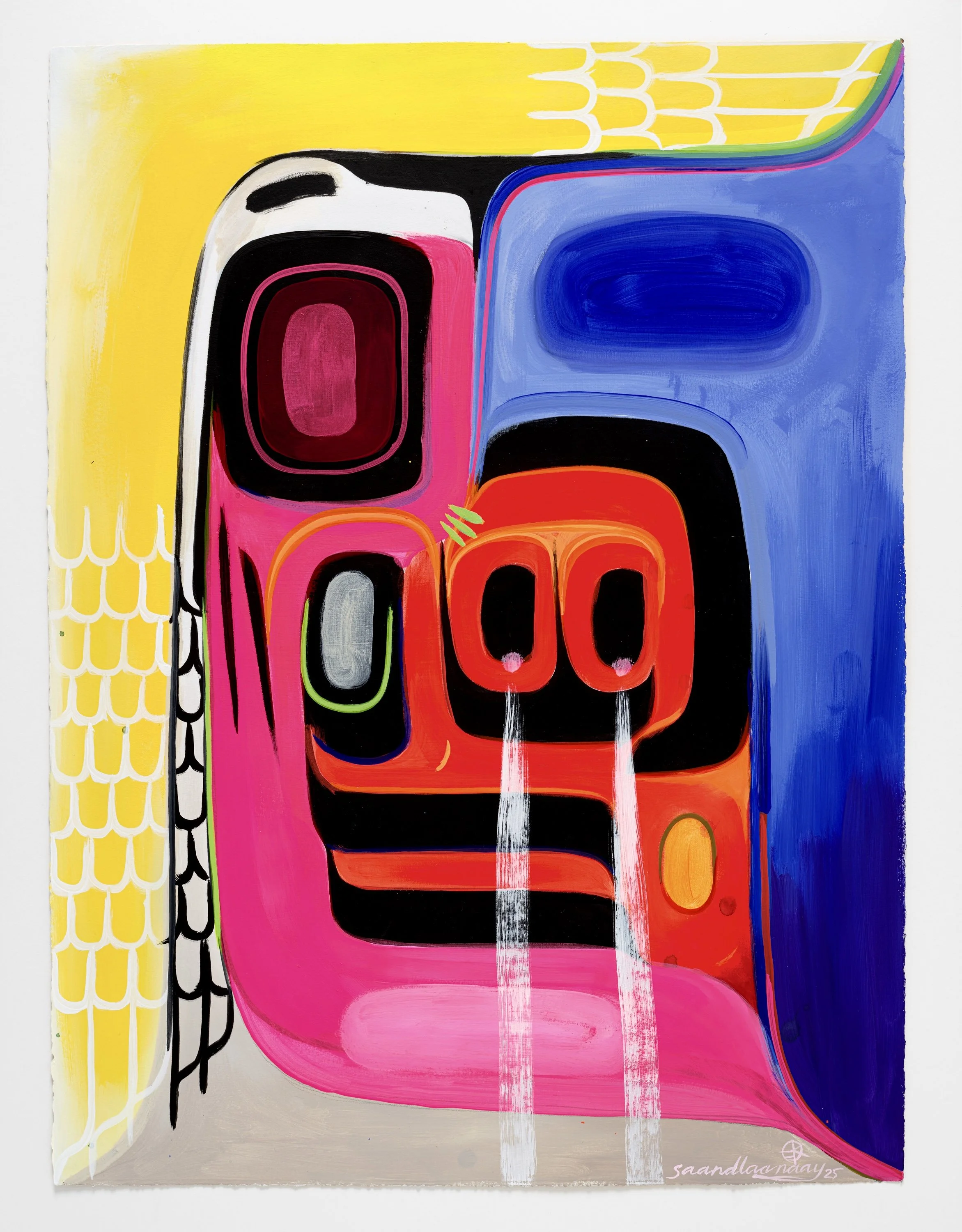 A Naaxiin ghost face adorns a cassette, a sonic record. She masks the record and brings it into her reality on paper. The title, in the Kaigani dialect of Haida, translates to, “The people of the afterworld are speaking to me.”