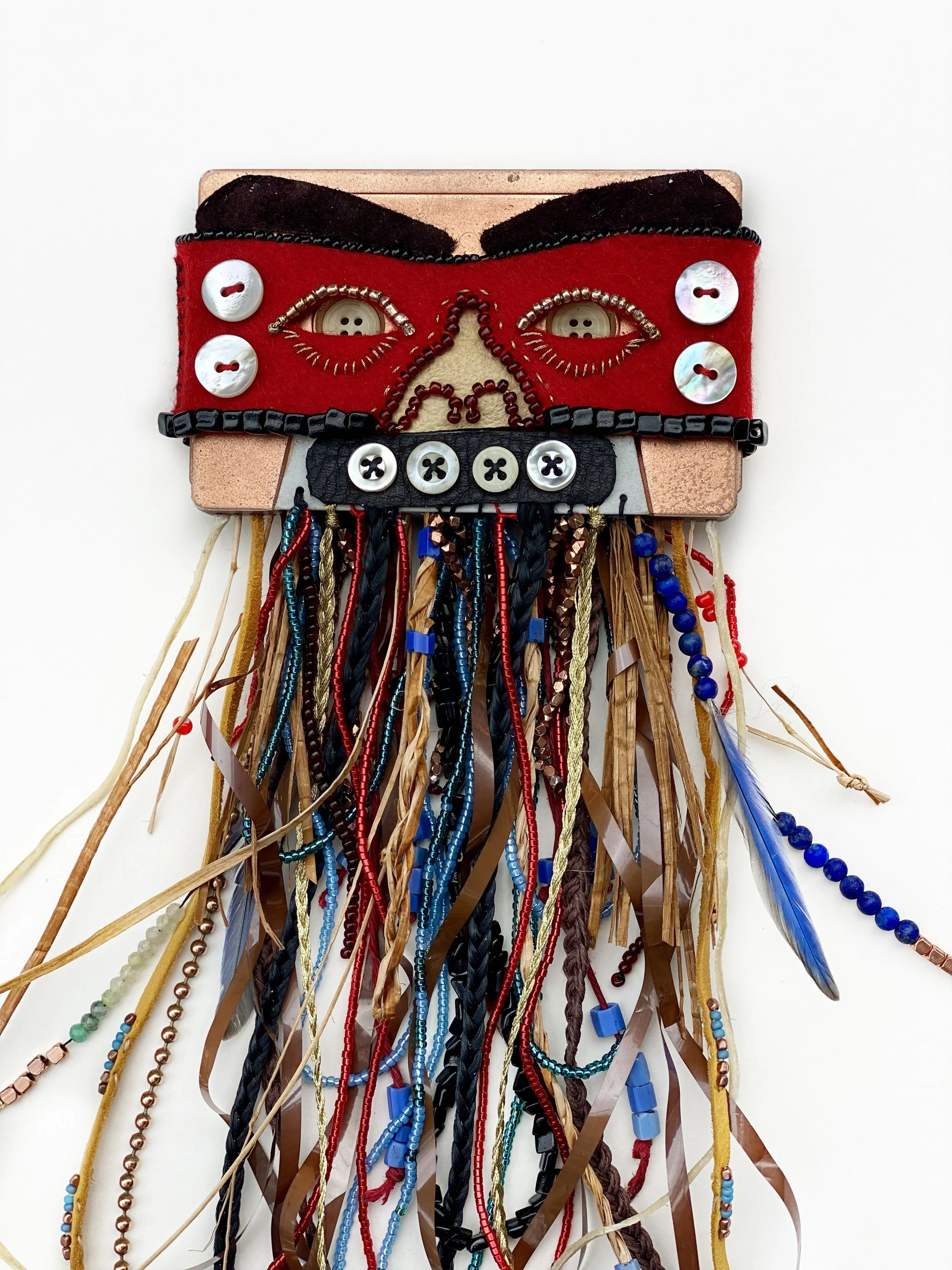 cassette tape, deer leather, felt, antique buttons, abalone buttons, glass beads, copper beads, red cedar bark, yellow cedar bark, white water turquoise, lapis lazuli beads, jade beads, sinew, sterling silver beads, gold filled beads, bone beads, bone buttons, thread, red cedar shavings from two totem poles, copper buttons, blue bird feathers, trade beads, and the cord I wore my copper on for 4 years.