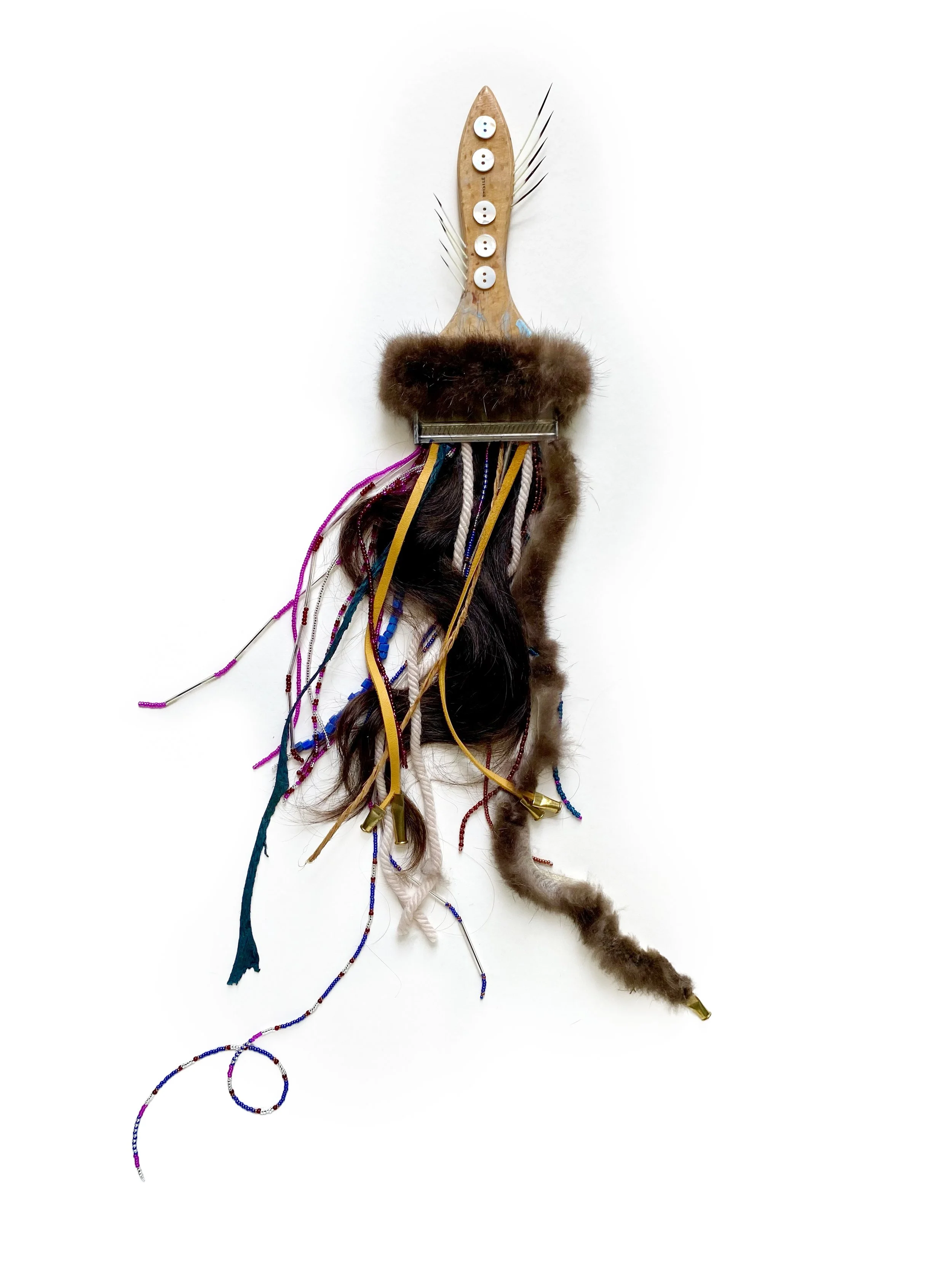 reclaimed 3” paintbrush handle, otter fur, hair, glass beads, trade beads, deer leather, .22 brass, salmon leather, merino yarn, red cedar bark, abalone buttons, porcupine quills.