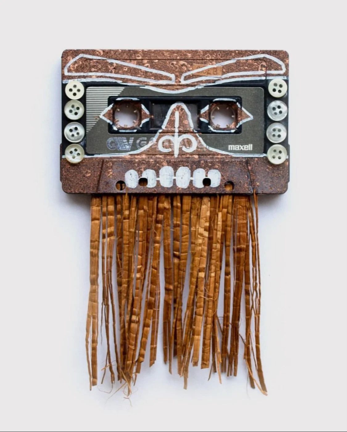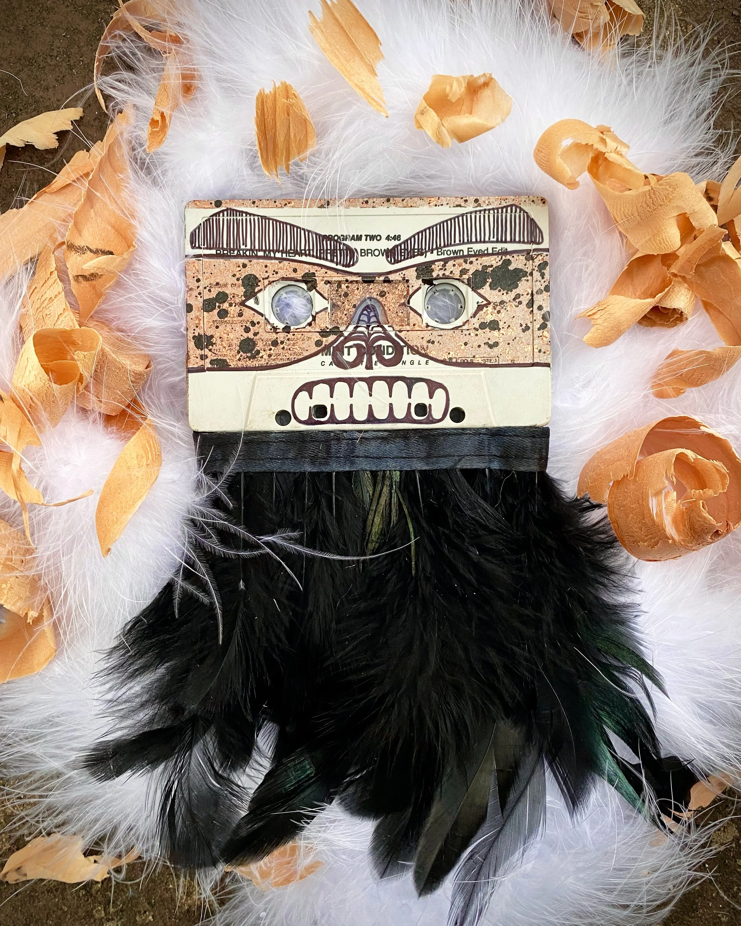 Insecure Mix. Canoe story. 31. Our stories carry us through time together (Dance to keep them alive.) Cassette Tape, Spray Paint, Antique buttons, Posca marker, Sharpie. 11”x4”x.75” Culture is the living, sentient spirit of a community in solidarity. It is the container that carries us through time together. We are connected to one another not only by our shared experiences, our relations, our histories, and our customs— but also by the deep tethers to places. Canoe story binds the efforts of consolidating modern research as a recorded oral history with the custom of evoking the supernatural. It considers the efforts of preparing for ceremony with material specific to place and the allocation of everyday objects for decoration. Haida people have lived among the largest Pacific red cedar trees, and for this reason were able to develop the most sophisticated canoes of the region through a maintained continuum of knowledge. Canoe Story creates an analogy to imagine the deep engineering of storytelling as an expansive, crafted practice. She is a cassette tape on the outside, but cedar pours from within, and she bears the face of an ancestor spirit adorned with regalia.
