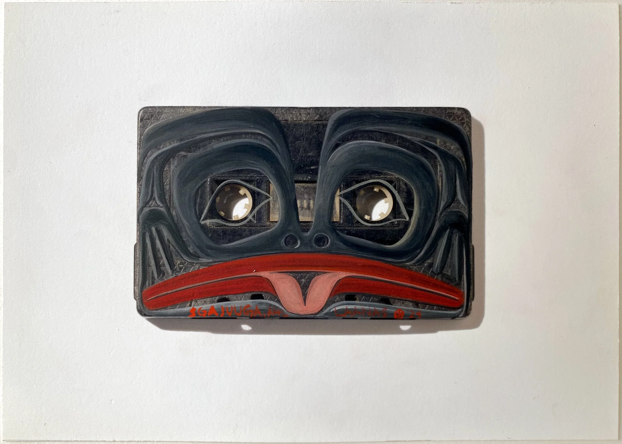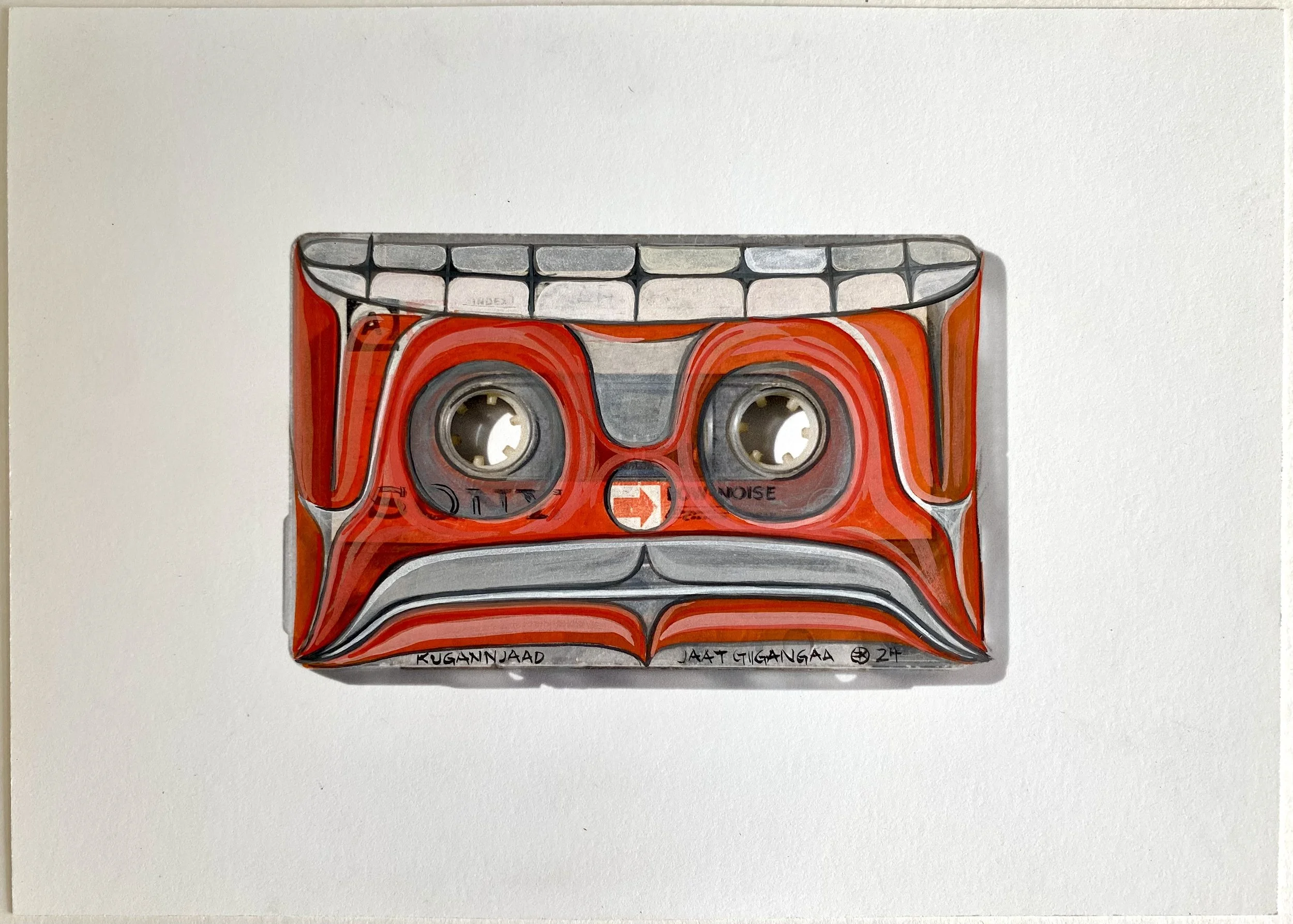 Descended from K’wii Taas (Earth Eater/Muddy Mouth), 2024. 5”x7” gouache on giclée print on paper